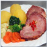 gefüllter Spießbraten mit Soße, Kartoffeln und Kaisergemüse
