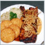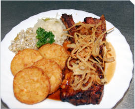 deftiges Grillrippchen mit Zwiebeln, Kartoffel-Rösti-Taler und Krautsalat