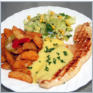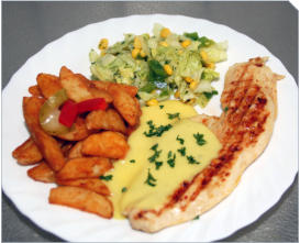 mariniertes, zart-gegrilltes Putensteak mit Kartoffelspalten und hausmacher Salat
